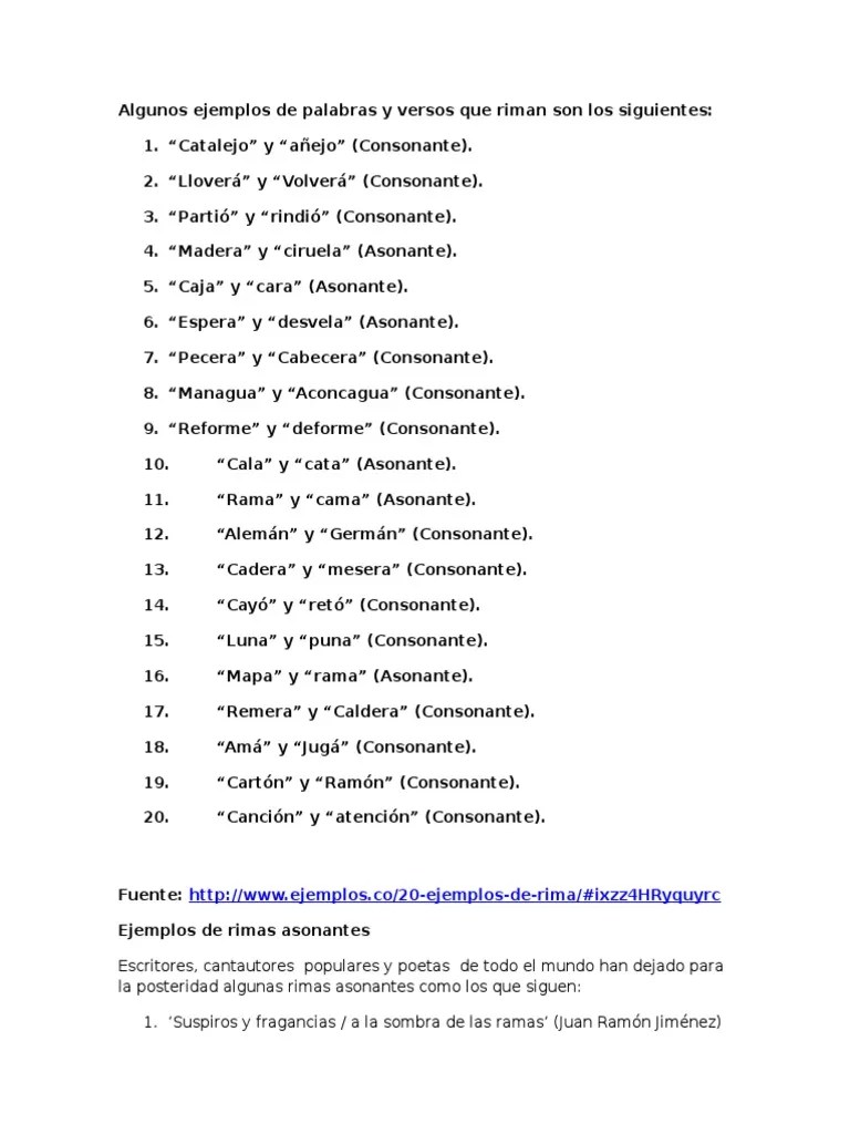 Tuvo un bote, una vela, una mar, un empeño. Y los redujo a cero. Ejemplos de palabras con rima consonante ; También denominadas rimas imperfectas, son las que coinciden en la sonoridad de las vocales de cada palabra a partir de la . Ejemplos de rima consonante y asonante ; Sonoramente todos los fonemas que siguen a la sílaba tónica de la última palabra del verso.